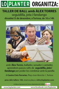 El 15 de desembre, Lo Planter organitzem un Taller de Ball amb Àlex Torres, ballador, sonador i cantador. Aprendrem passos solts de seguidilla, jota i fandango per poder-los combinar amb la parella.