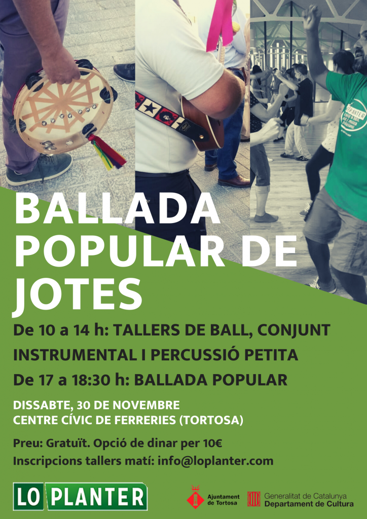 El dissabte 30 de novembre, Lo Planter participarem a la VII Fira de la Tardor de Sant Eloi del barri de Ferreries (Tortosa). Durant el matí, impartirem 3 tallers simultanis de ball, conjunt instrumental i percussió petita i a la tarda, farem una ballada popular per posar en pràctica tot allò que haurem après durant el matí. Està oberta a tothom qui vulgui participar!